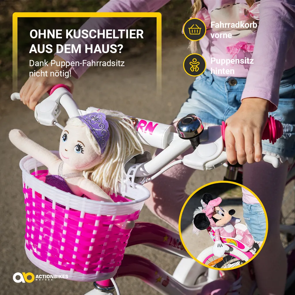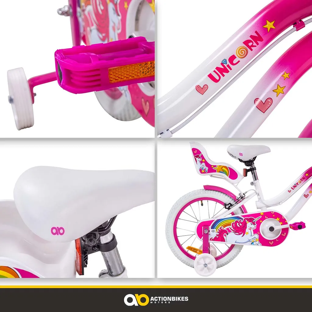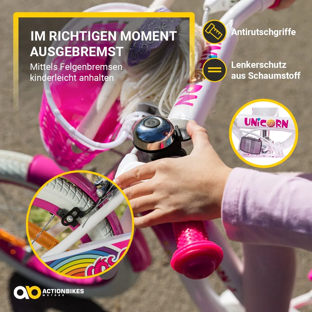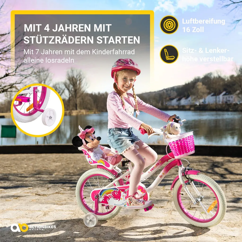 Actionbikes Kinderfahrrad Unicorn 16 Zoll – Kinder Fahrrad – Caliper Bremsen – Kettenschutz – Stützräder – Kinderrad – Rad – Bike – Mädchen – Pink – 4-7 Jahre