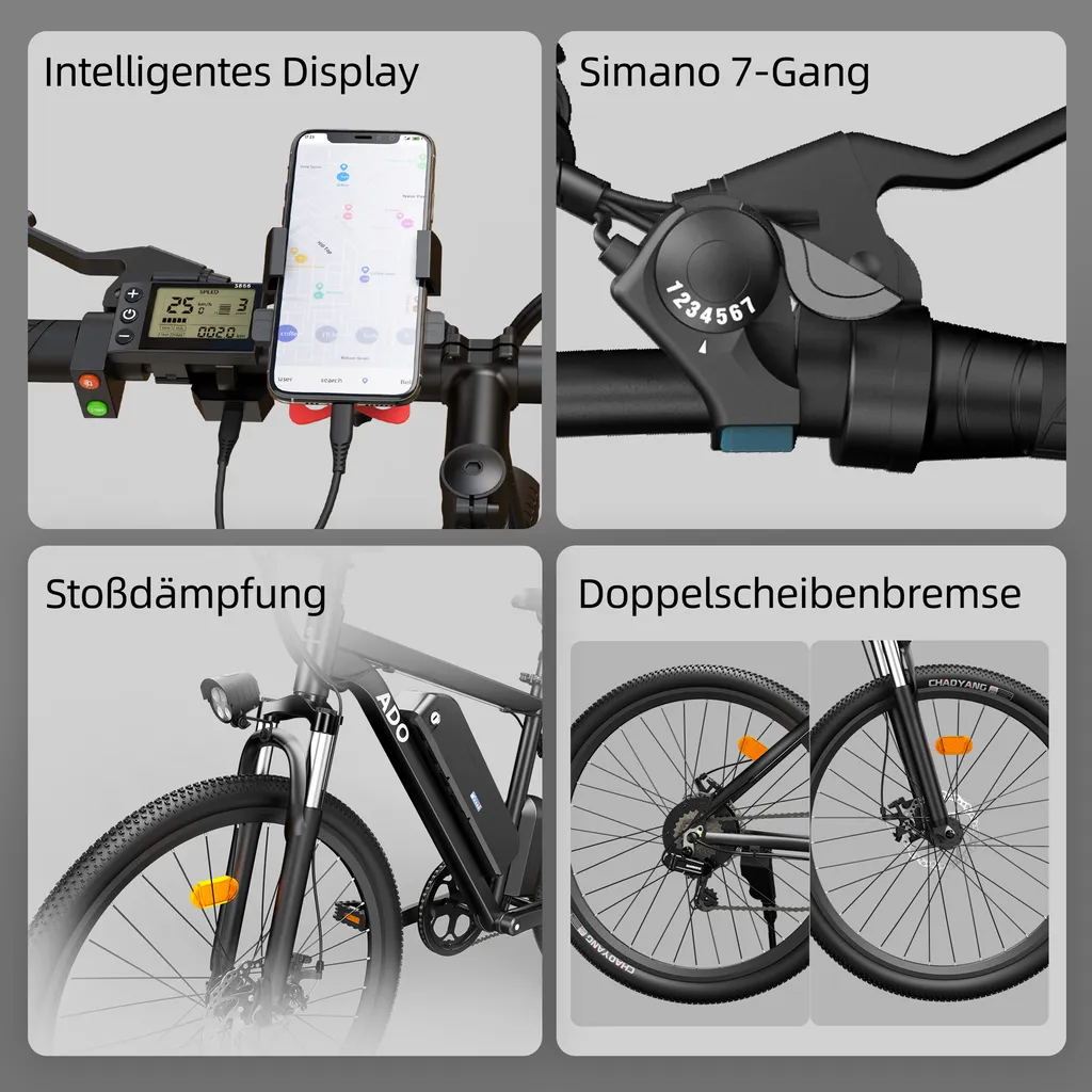 ADO A26 Pedelec E-bike Elektrofahrrad Für Erwachsene Herren Damen, 26″ Ebikes Full Terrain, Shimano 7-Gang-Getriebe/enduro E Bike/Höchstgeschwindigkeit 25km/h/Doppelscheibenbremsen