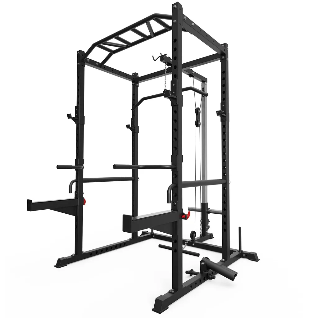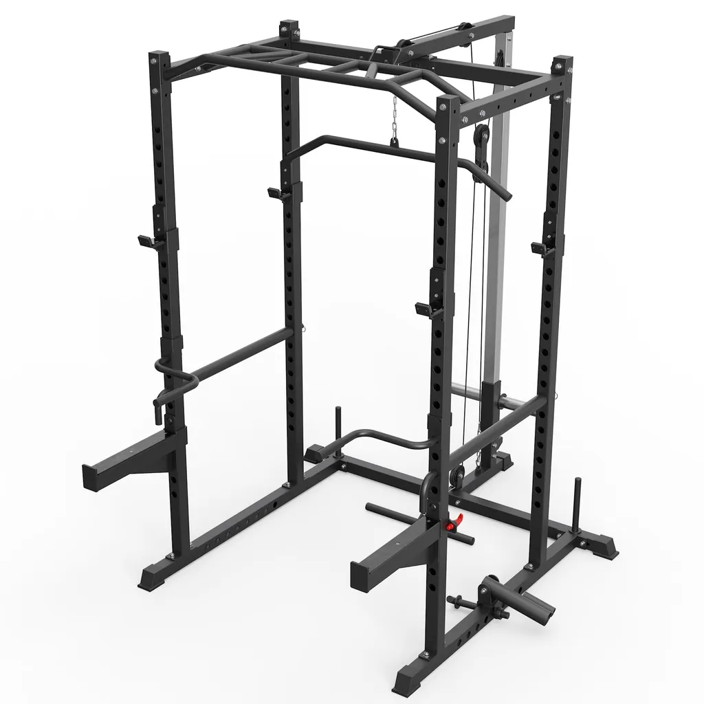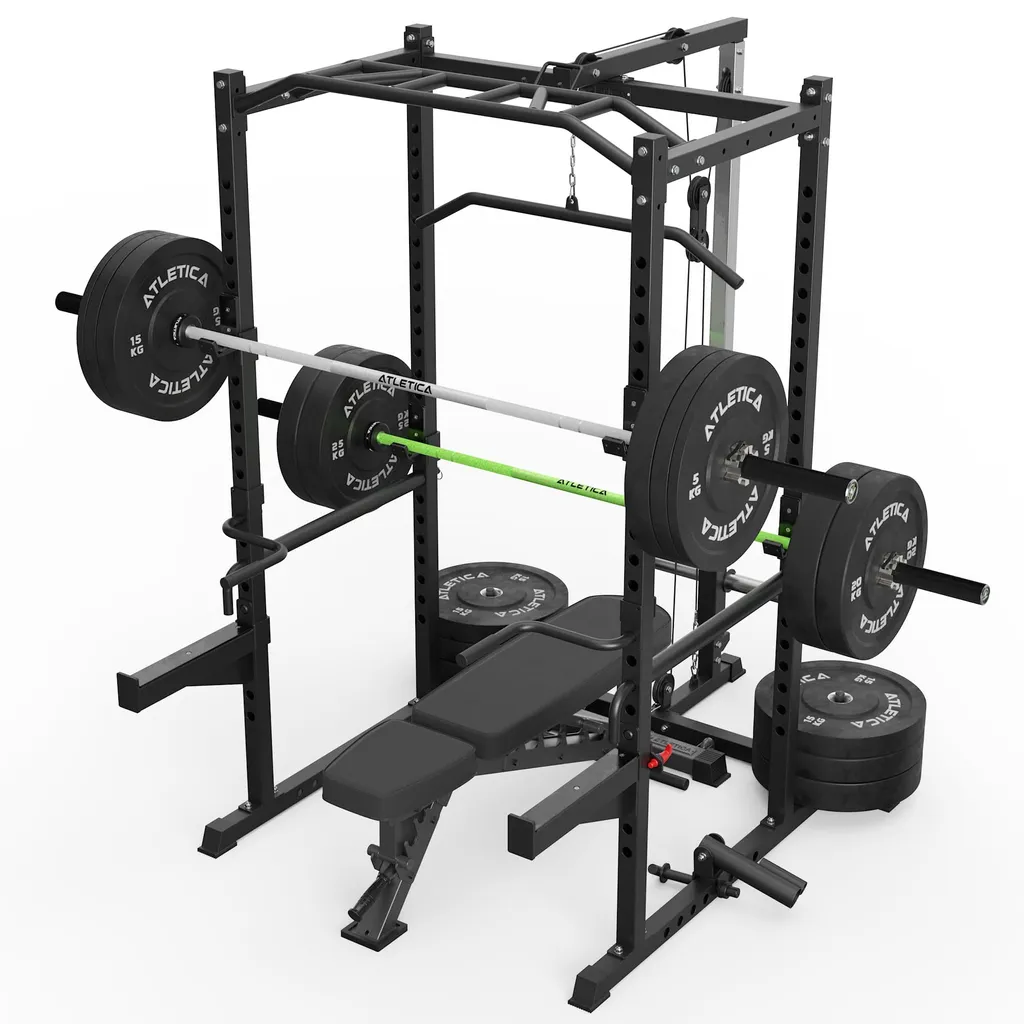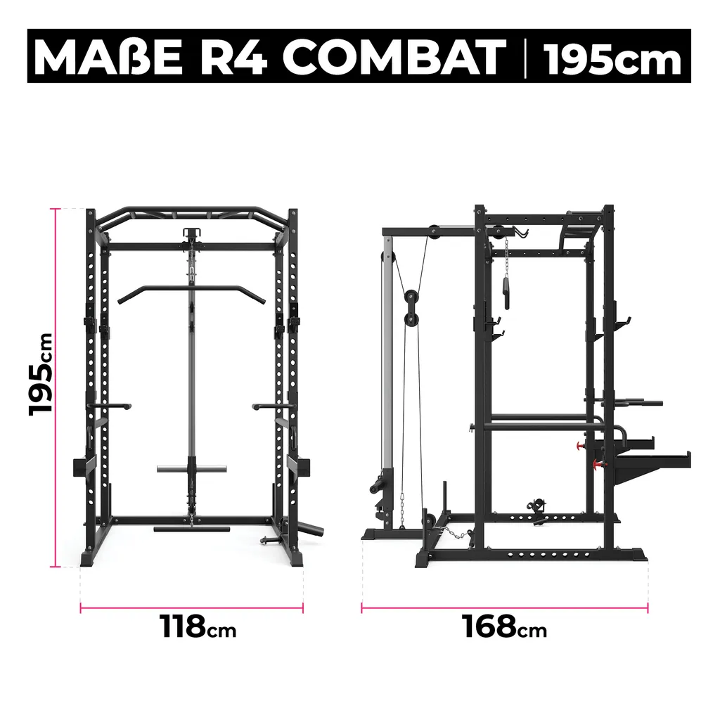ATLETICA R4 Combat | 195 Cm Low Version Power Rack Mit Latzug, Pull-Up/Dip Bar, Spotter Arms, Pin-and-Pipe-Safeties, J-Hooks, Landmine & Weight-Pins