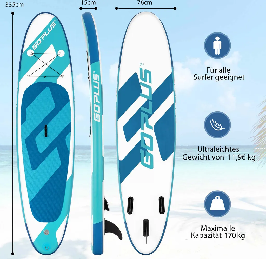COSTWAY 335cm SUP Board Set Aufblasbar Mit Sicherheitsleine Paddel Pumpe Center Finne Rucksack & Reparaturset 170kg Belatbar Weiß+Blau