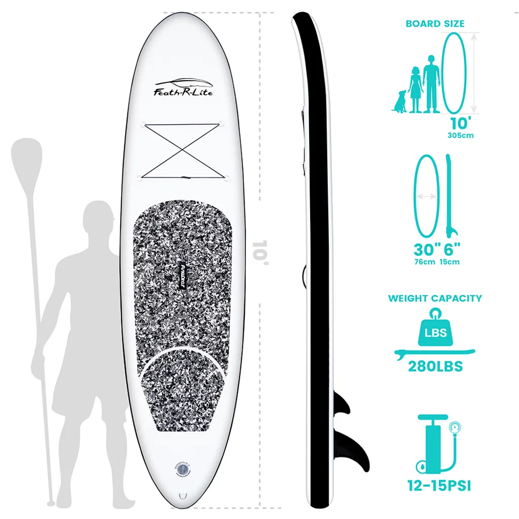 FEATH-R-LITE- Stand Up Paddle Board, SUP Surfboard Surfbrett 305x76x15cm Mit Verstellbares Paddel, Handpumpe, Rucksack,Schwarz Und Weiß