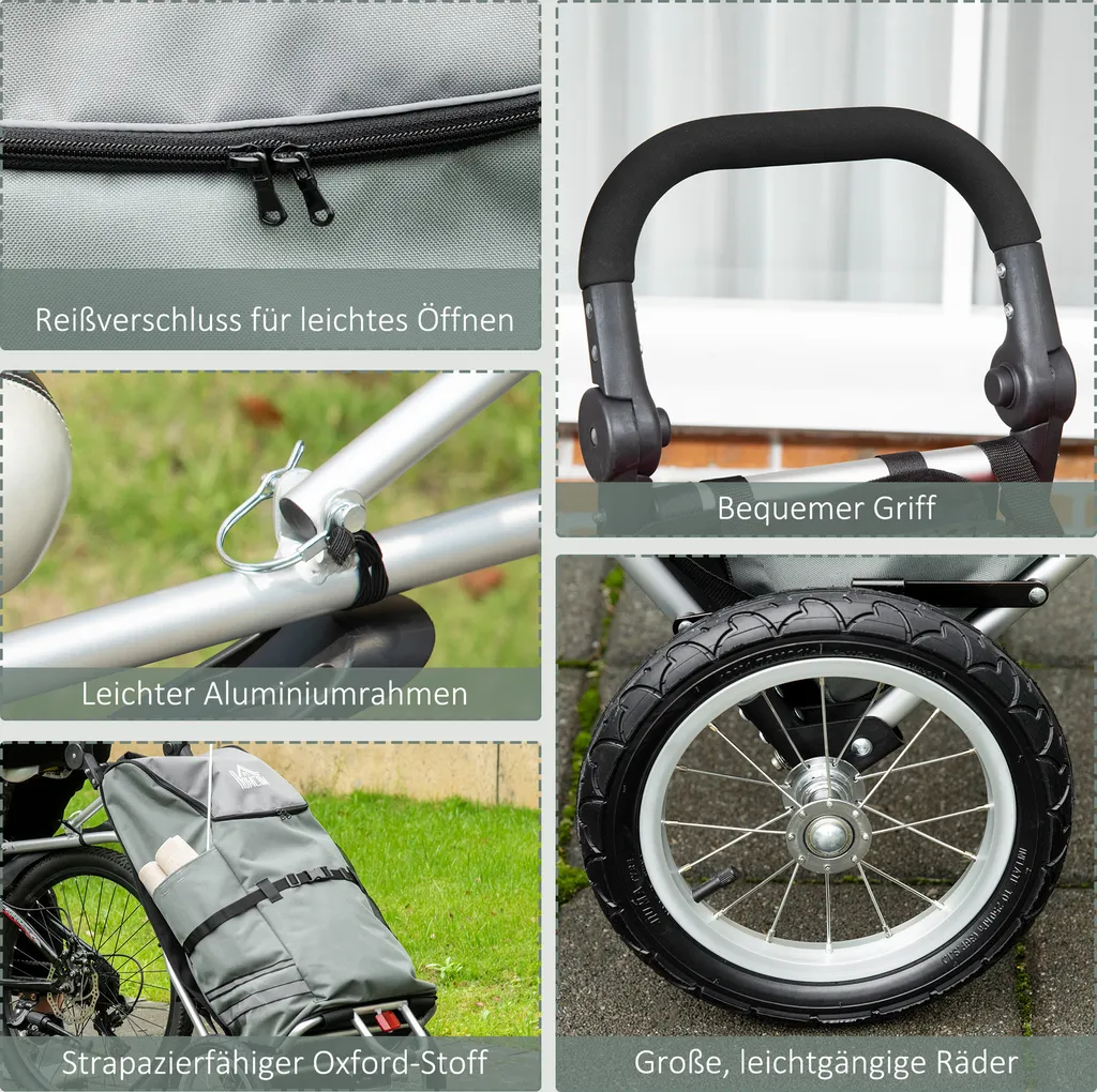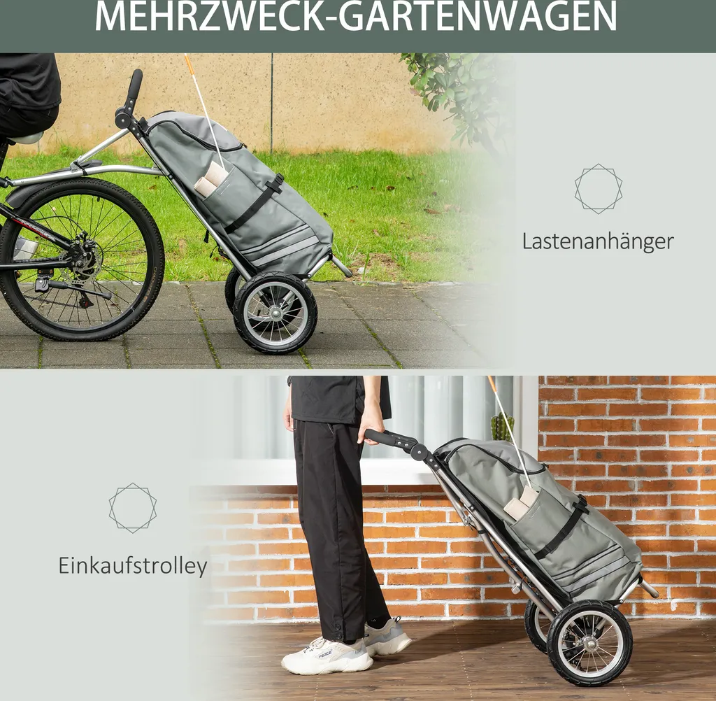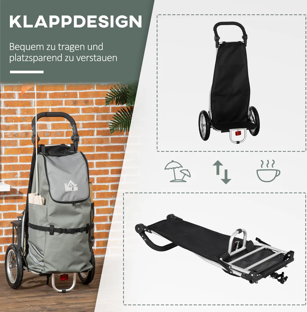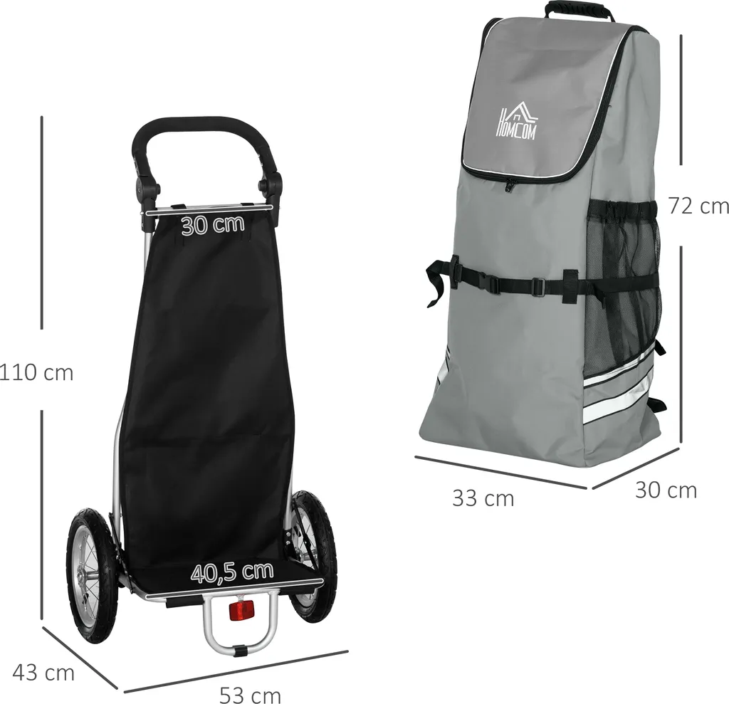 HOMCOM 2 In 1 Lastenanhänger Einkaufstrolley Für Einkaufswagen Fahrradanhänger Mit Verbindungsschellen Für Fahrradkupplung 12 Zoll-Luftreifen 24,3 Kg Max 55 L Alu+Oxford Grau+Silber 53 X 43 X 110 Cm