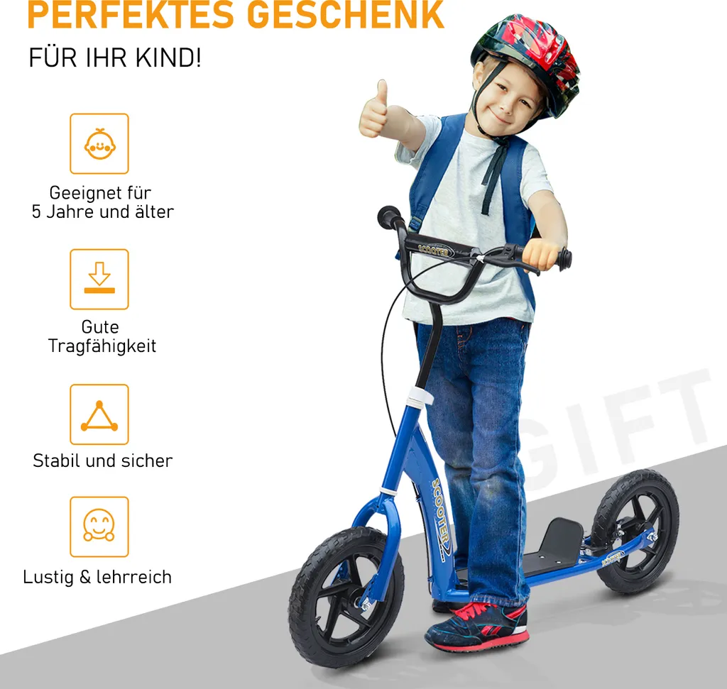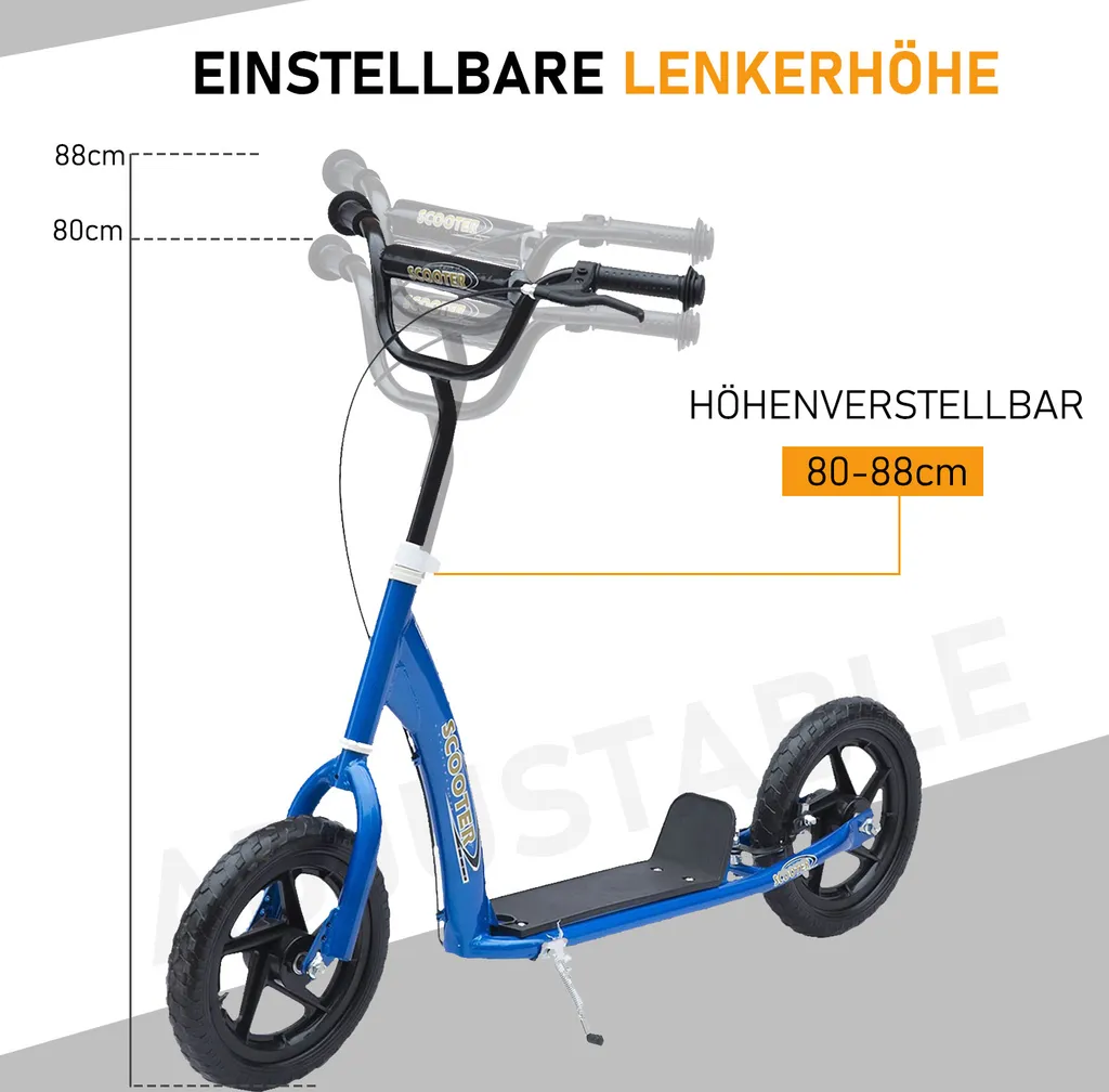 HOMCOM Kinderroller Mit Hinterbremse Kickscooter 12 Zoll Tretroller Roller Scooter Cityroller Für Kinder Kickboard Höhenverstellbar Stahl EVA Blau 120 X 52 X 80-88 Cm