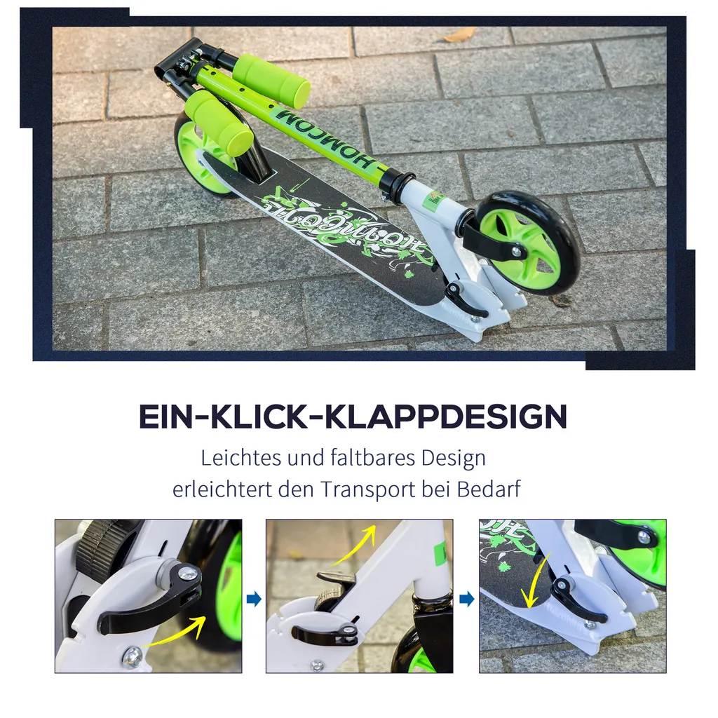 Schreibe die erste Rezension für „HOMCOM Scooter Kinderscooter Klappbar Kickscooter Mit Hinterbremsen Ø145 Mm Rädern Tretroller Höheverstellbar Bis 50 Kg Belastbar Für 4-8 Jahre Aluminium Eva Grün 72,8 X 33,4 X 75-85 Cm“ Antwort abbrechen