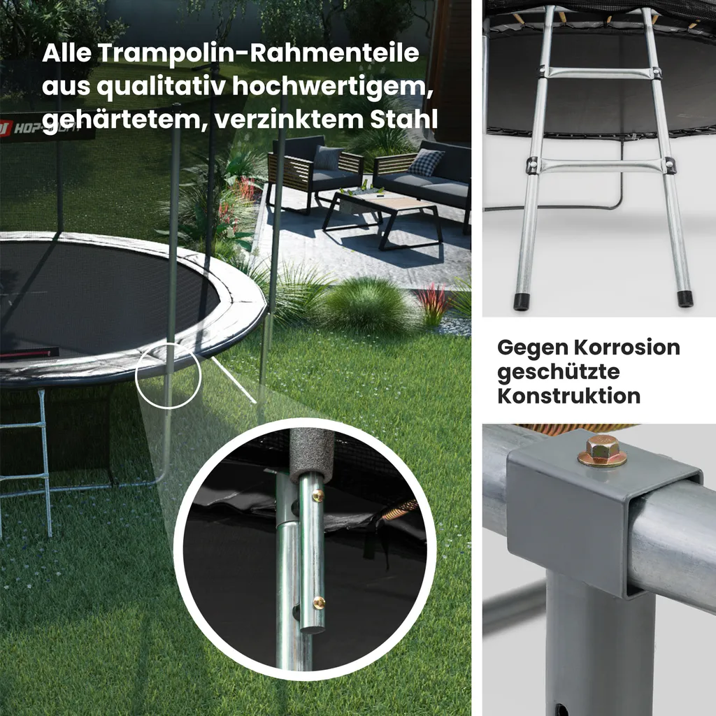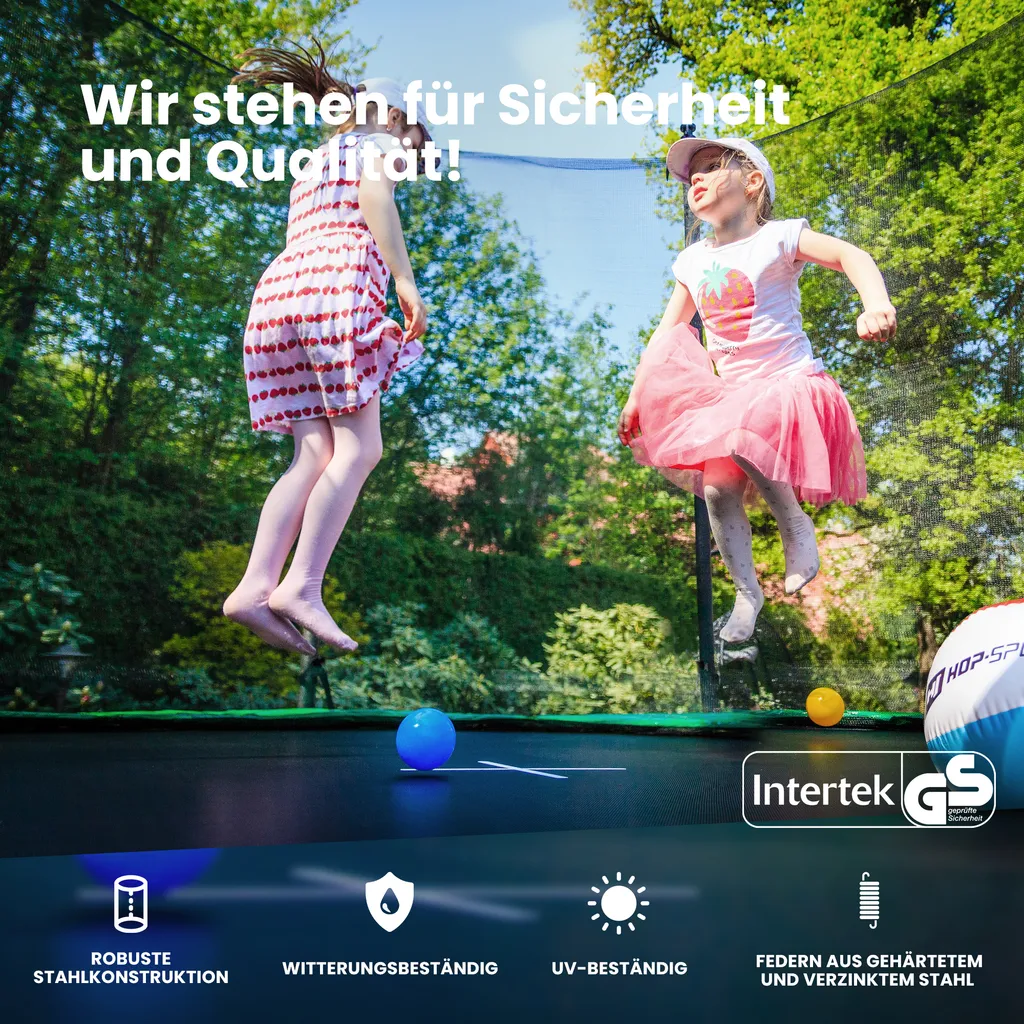 Hop-Sport Trampolin Outdoor Ø 430 Cm – Gartentrampolin Komplettset Mit Stabilen U-Beinen, Innenliegendem Netz, Sprungtuch Und Leiter Sowie Extra-Zubehör Wie: Abdeckplane, Spielbälle Und Bodenhaken