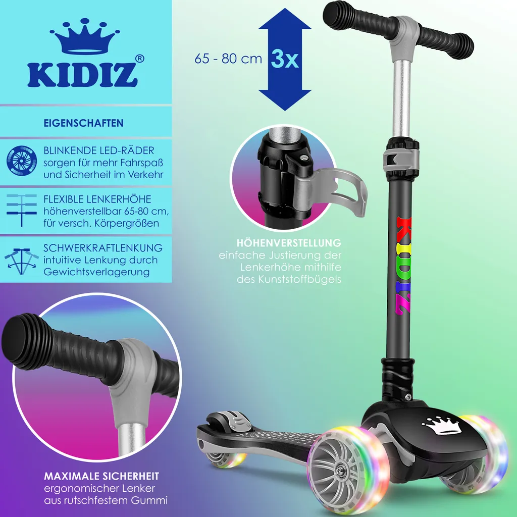 KIDIZ® Roller Kinder Scooter X-Pro2 Dreiradscooter Mit PolyurethanLED Leuchtenden Räder Kinderroller Faltbar Tret-Roller Höhenverstellbarer Cityroller Kinderscooter Für Jungen Mädchen 3-12 Jahre, Farbe:Schwarz