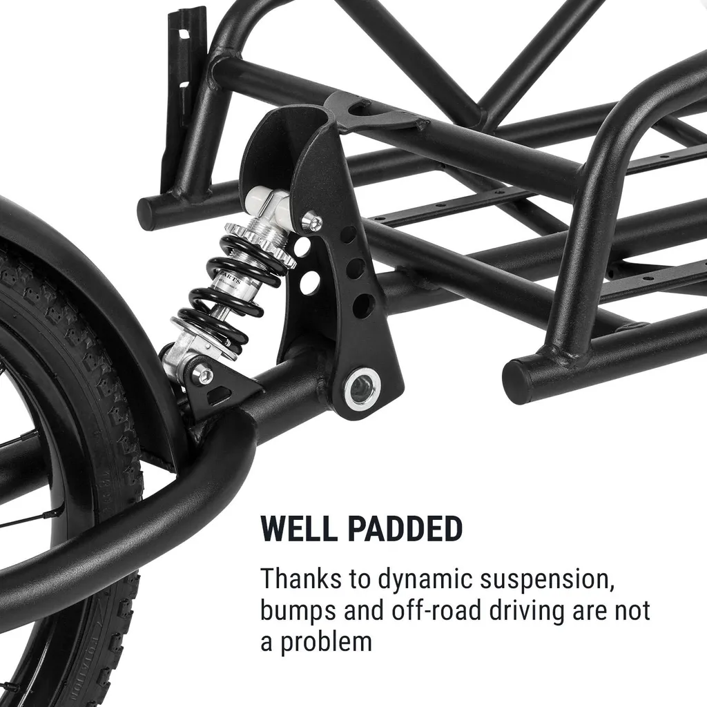 Klarfit Follower Fahrradanhänger Lastenanhänger , Einspurig , Ladefläche: 35,5 X 25,5 X 65 Cm (BxHxT) , 11 Kg , 35 Kg Ladegewicht , Stahlrahmen , 16″ Rad , Dynamische Federung , Reflektoren , Sicherheitswimpel , Schwarz