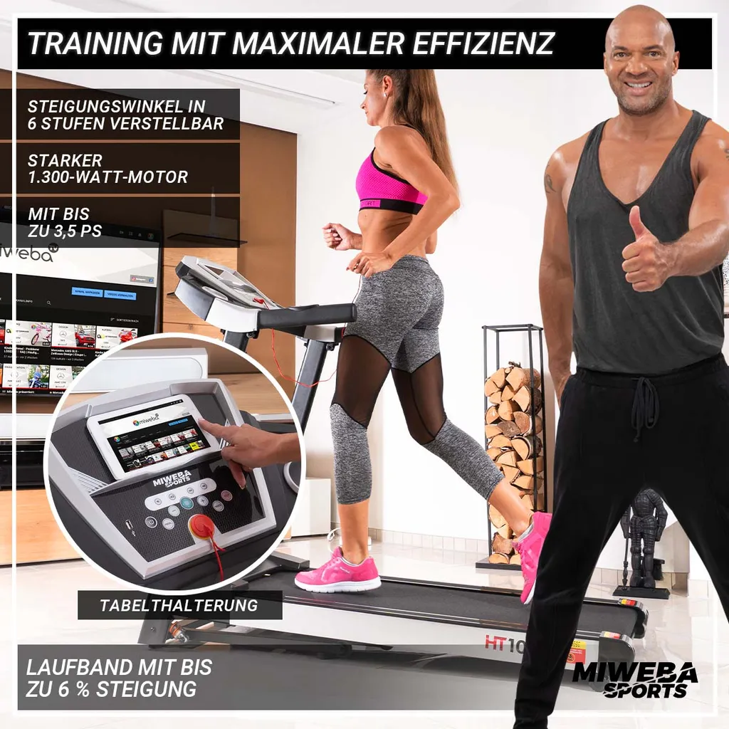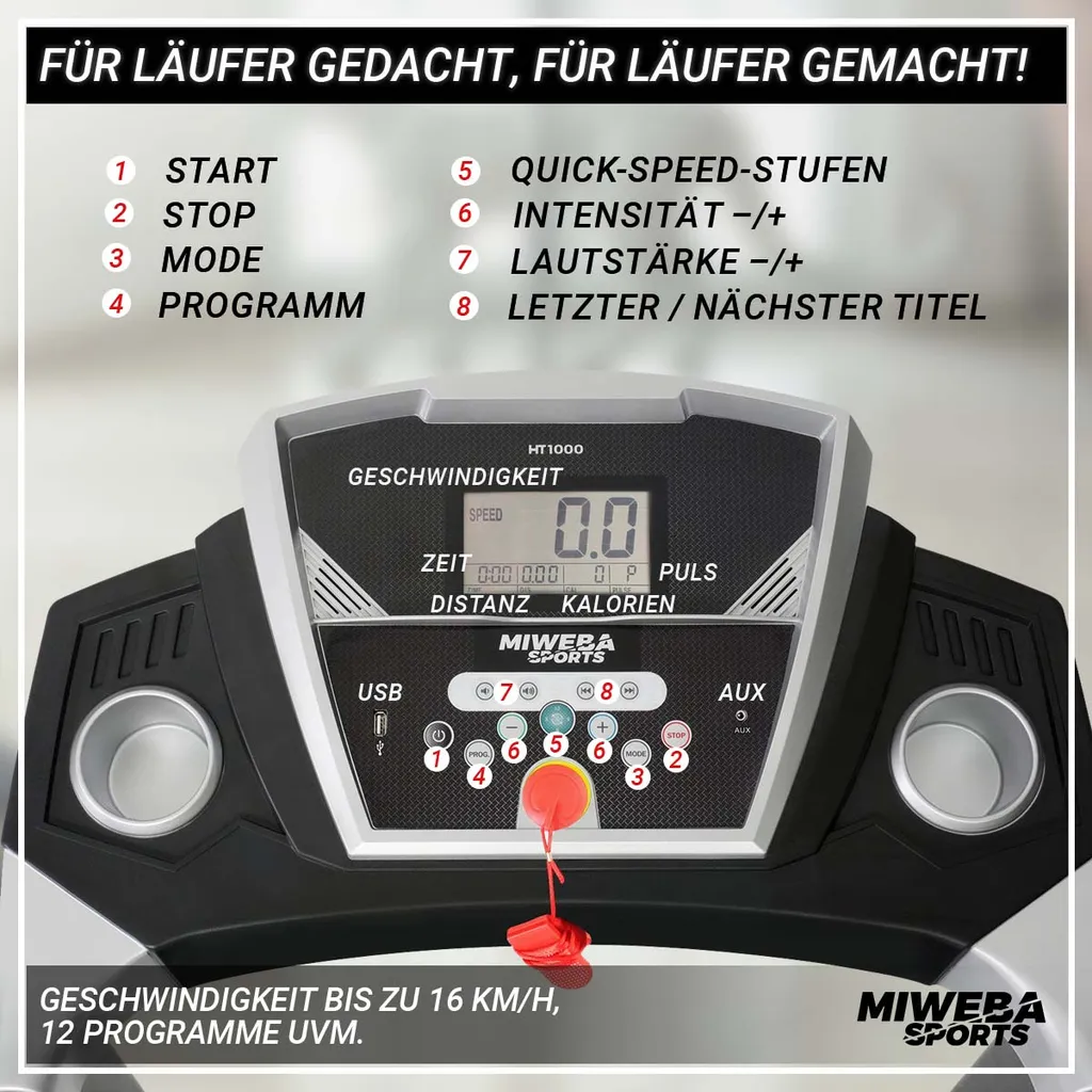 Miweba Sports Laufband Home Track HT1000F – Klappbar – Mit Steigung – 1-16km/h – Quick-Speed – Safety-Key – Tablethalterung – Bis 120 Kg – Fitnessgeräte – (Schwarz)