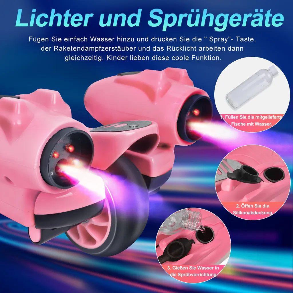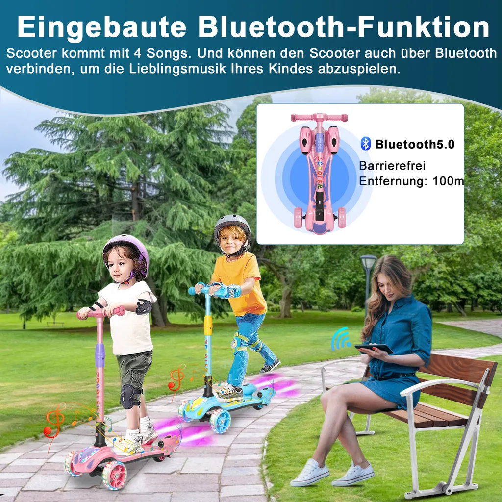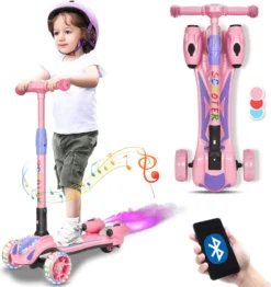 Roller Kinder 3-10 Jahre, Kinderroller 3 Räder, Mit Bluetooth Musik Spray LED Rädern Höhenverstellbar Faltbar Kinderscooter Dreiradscooter Tretroller Scooter Für Kinder Jungen Mädchen Bis 60kg (Rosa)