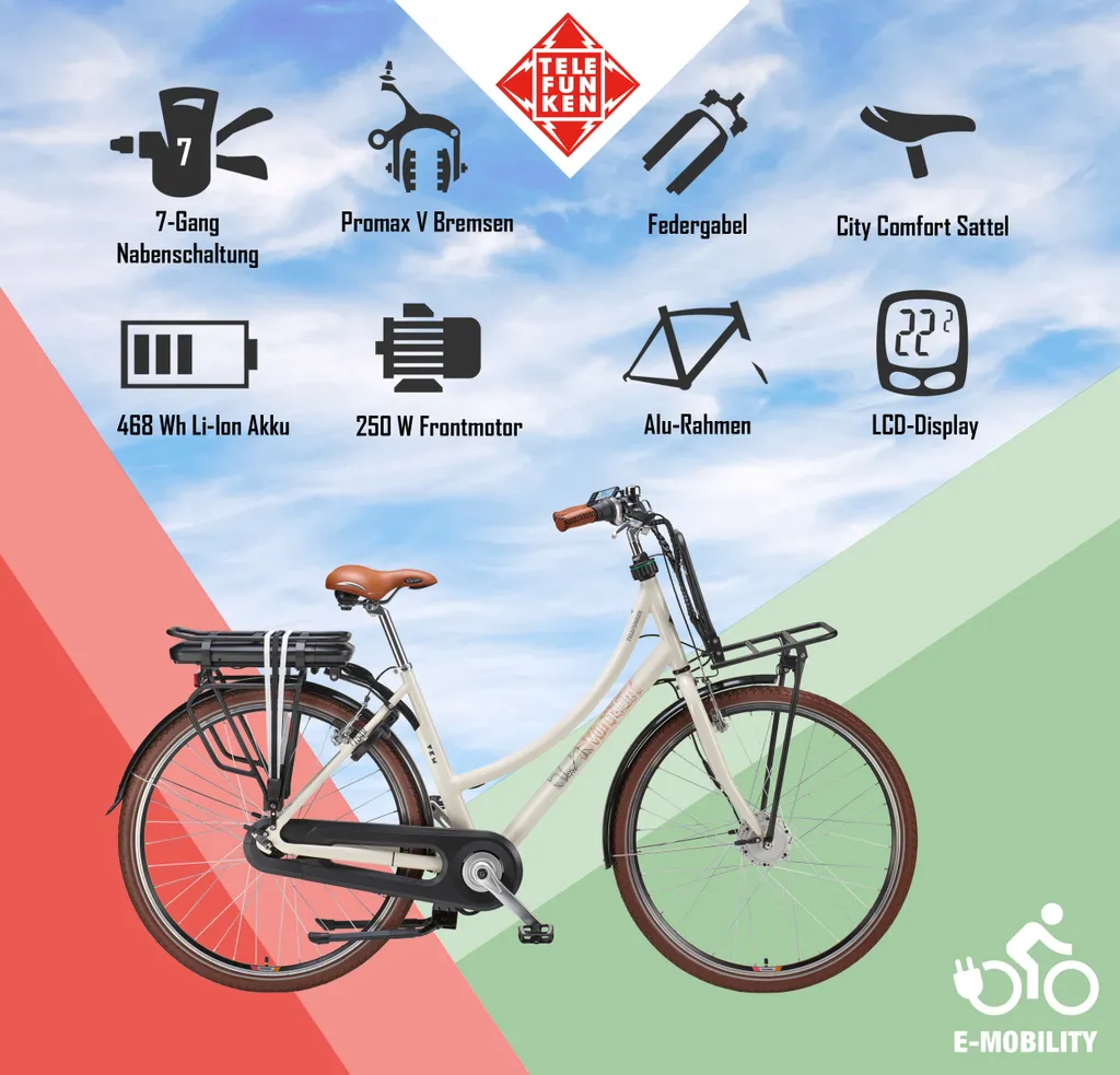 Telefunken E-Bike Elektrofahrrad Alu 28 Zoll Mit 7-Gang Shimano Nabenschaltung, Pedelec Citybike Leicht, 250W Und 13Ah, 36V Li-Ion Akku, RT540 Multitalent, Creme